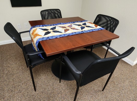 Create a highly detailed, sharp focus image of a stunning table runner made with vibrant “Just Dandy” fabrics from Kate Colleran Designs featuring intricate star blocks created using the Corner Beam and Diamond Rects rulers. The runner should be elegantly displayed on a rustic wooden table, highlighting the contrast between the dark and light fabrics. Soft, natural light should illuminate the textures and colors of the fabric, enhancing their visual appeal. Ensure the image captures the precision and craftsmanship involved, with a high-resolution quality that showcases every detail vividly.